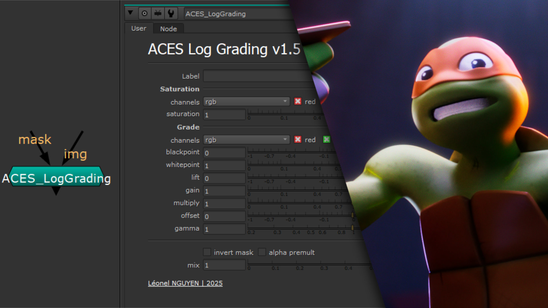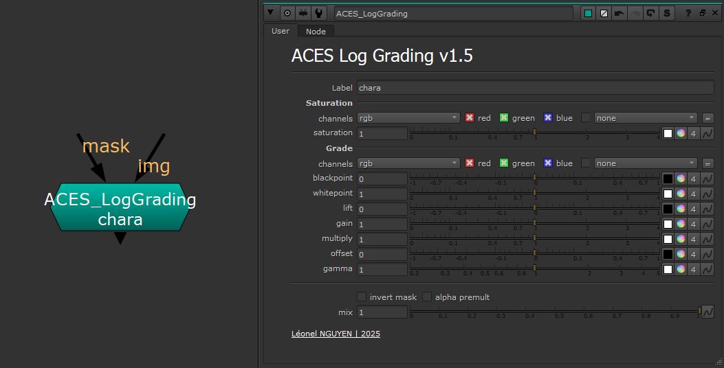 This tool allows to do color corrections in ACEScc. It's new 1.5 version now has the saturation slider from a color correct allowing it to saturate with adding a color to it. It also has a Label put directly upfront so you can efficiently name your grading nodes, without having to open the "node" menu.