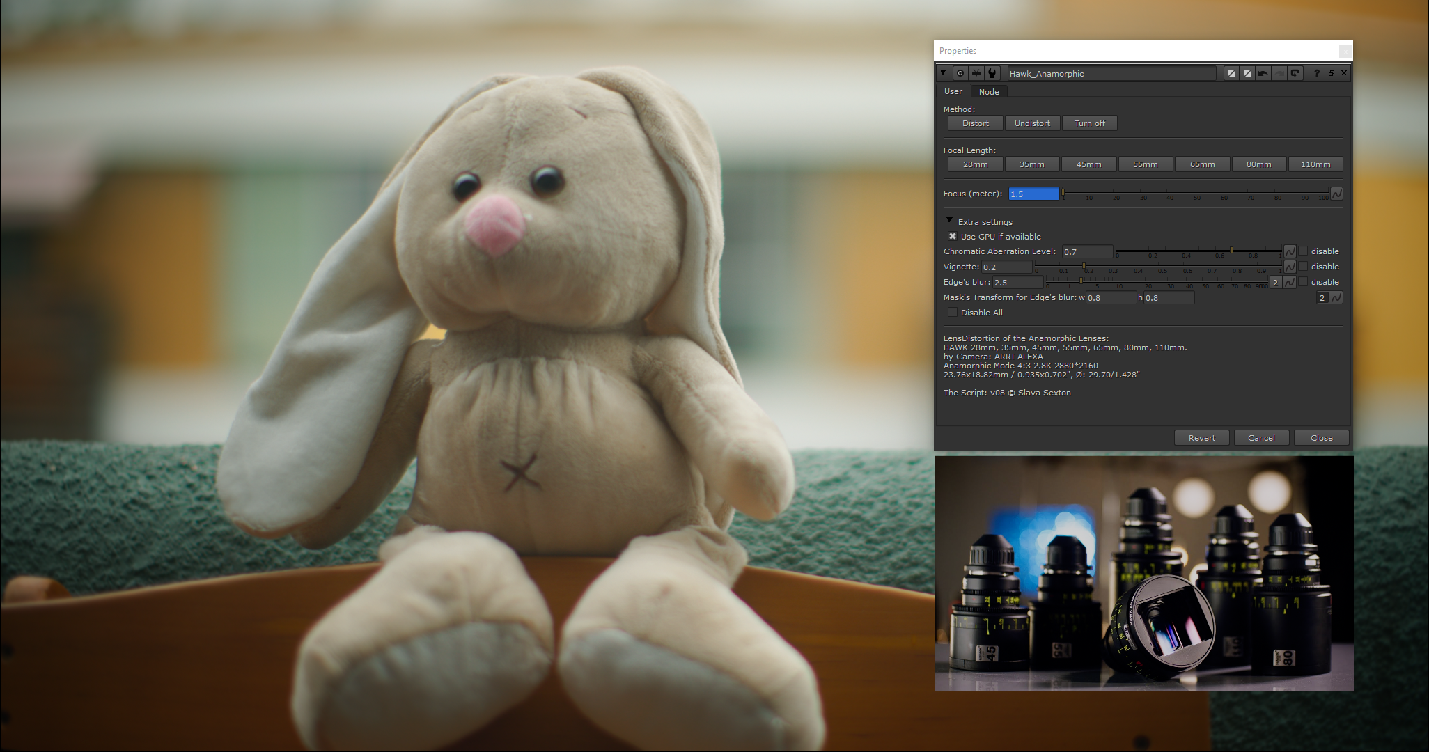 Adds natural HAWK anamorphic lens character - focus breathing, distortion, vignetting, chromatic aberration, and edge softness. Ideal for CG and AI-generated footage.