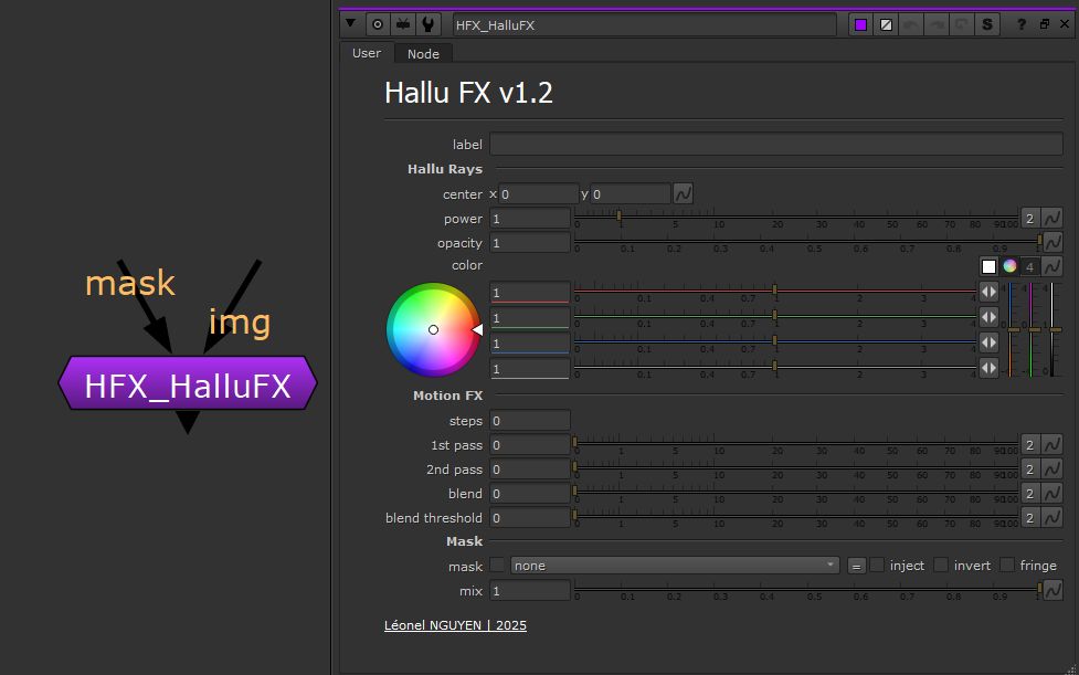 The Hallu rays are godrays that have a color to make the effect punchy. In Motion FX you have the steps to drive the number of frames that will be used to expand the effect and smooth it with the 1st pass and 2nd pass of vector generated motion blur. The blend is here to make sure that you can tweak the transition between hallucination and original image.