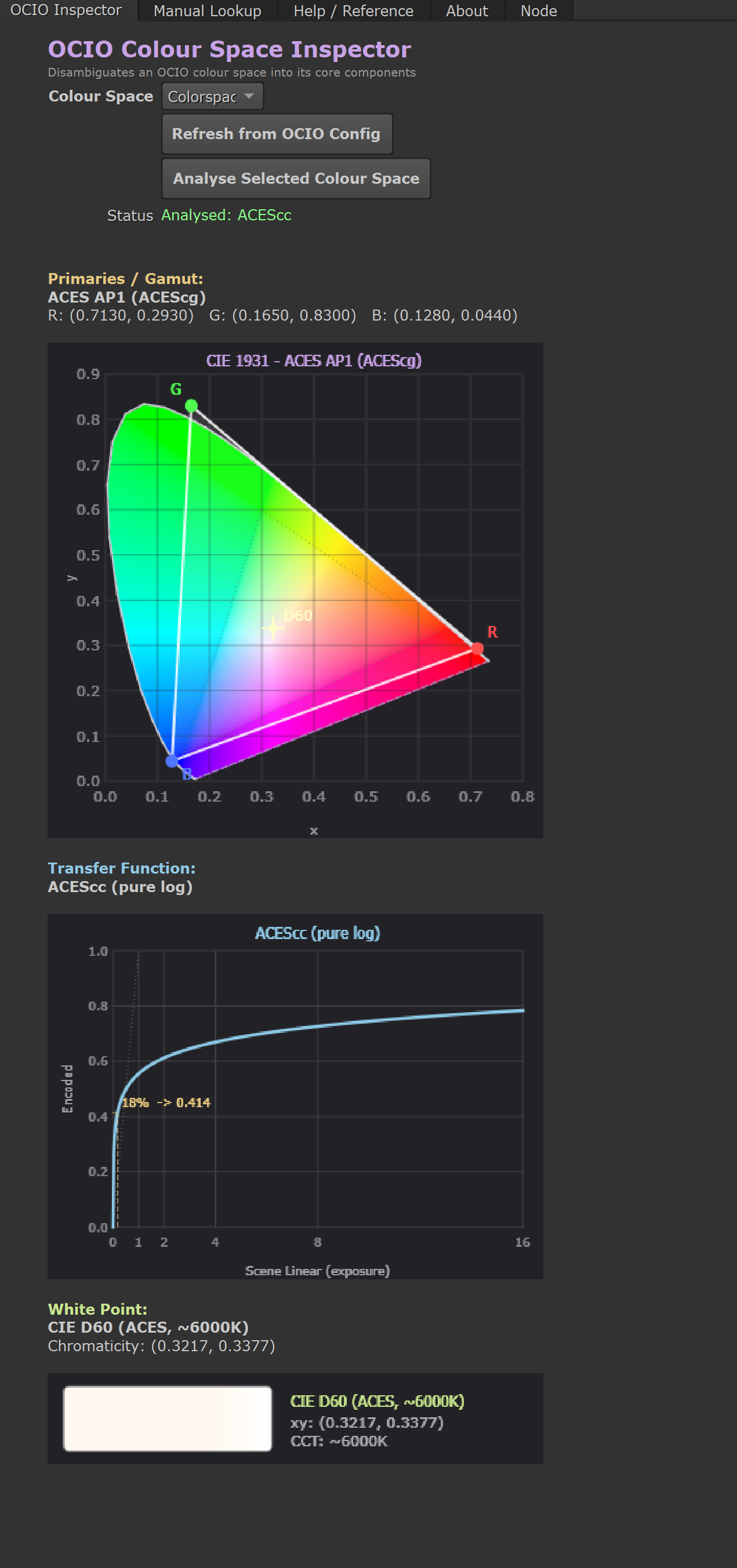 Breaks down any OCIO colour space into primaries, transfer function & white point with CIE diagrams, curve plots and colour temperature swatches.