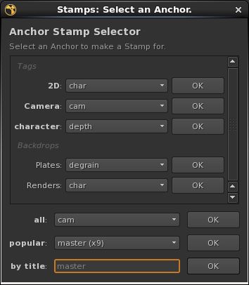 The tag system allows for organising the stamps into categories for super quick access to every Stamp from any part of the node graph. The Anchor Selection Panel will let you quickly search for the Stamp you want, sorting based on different filters like their tags, the labels of the backdrops where they live, or their popularity (how many times you've used them).