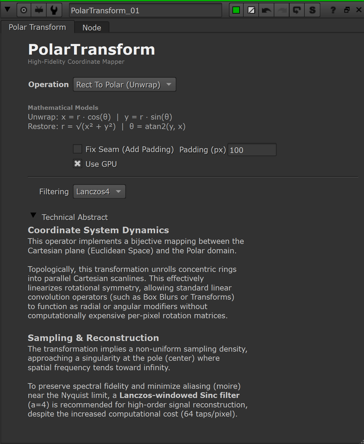 PolarTransform is a high-fidelity coordinate-space operator mapping between Cartesian (x, y) and polar (r, θ) coordinates. By linearizing rotational structure, it allows blurs, transforms, and procedural modulation to act radially or angularly without per-pixel rotations or repeated resampling. Both unwrap (Rect → Polar) and restore (Polar → Rect) modes are supported, with radius normalization. Optional Fix Seam adds padding and wrap-around sampling to maintain continuity at the angular seam.