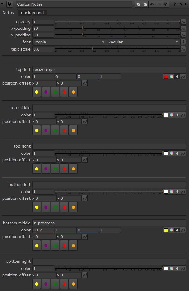 The properties panel includes several pre-defined color buttons for quick formatting. You can also change text color by standard Nuke color knob.