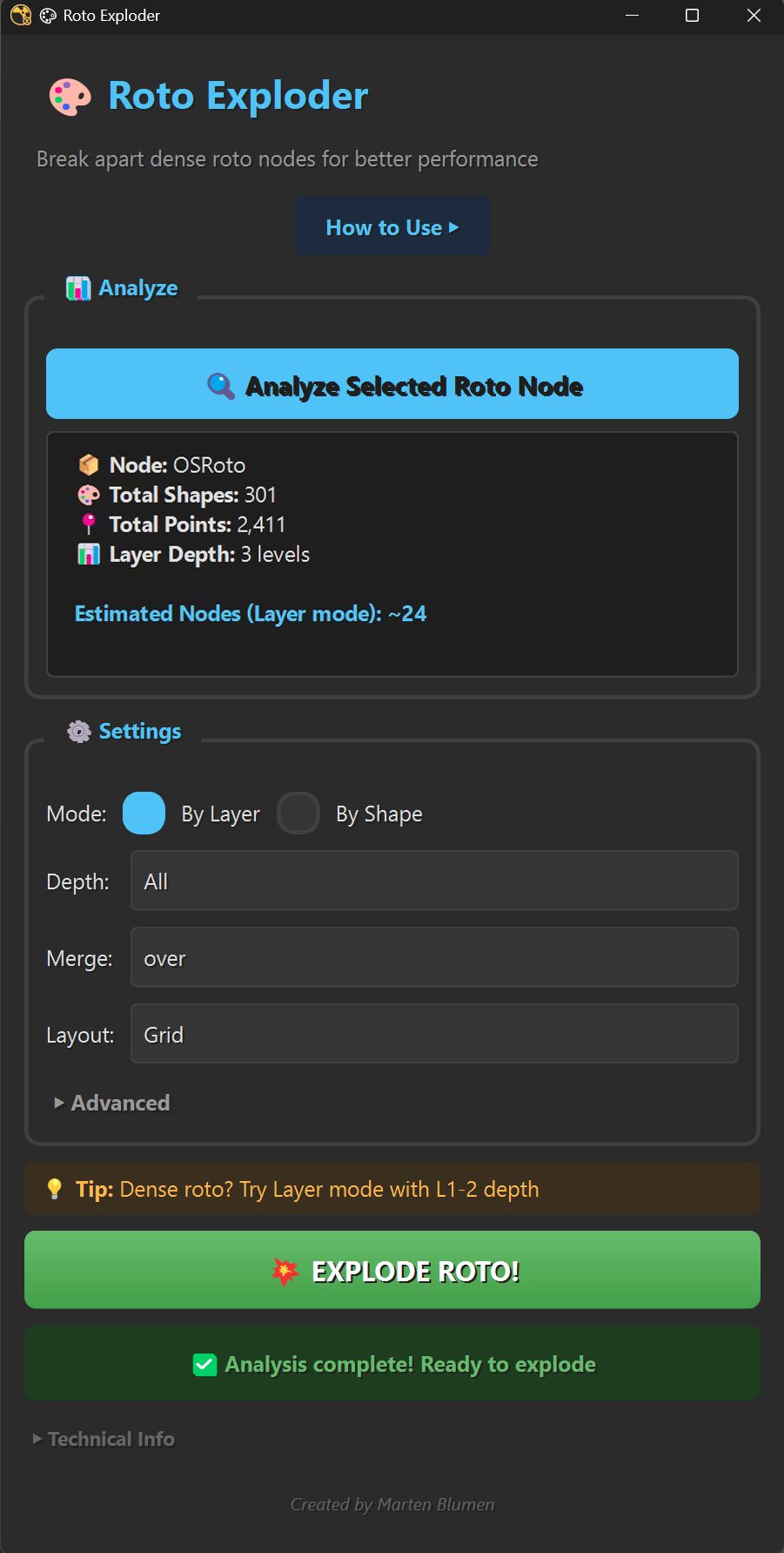 Explodes dense Roto nodes into separate nodes to improve performance, organization, and usability while preserving structure and flexibility.