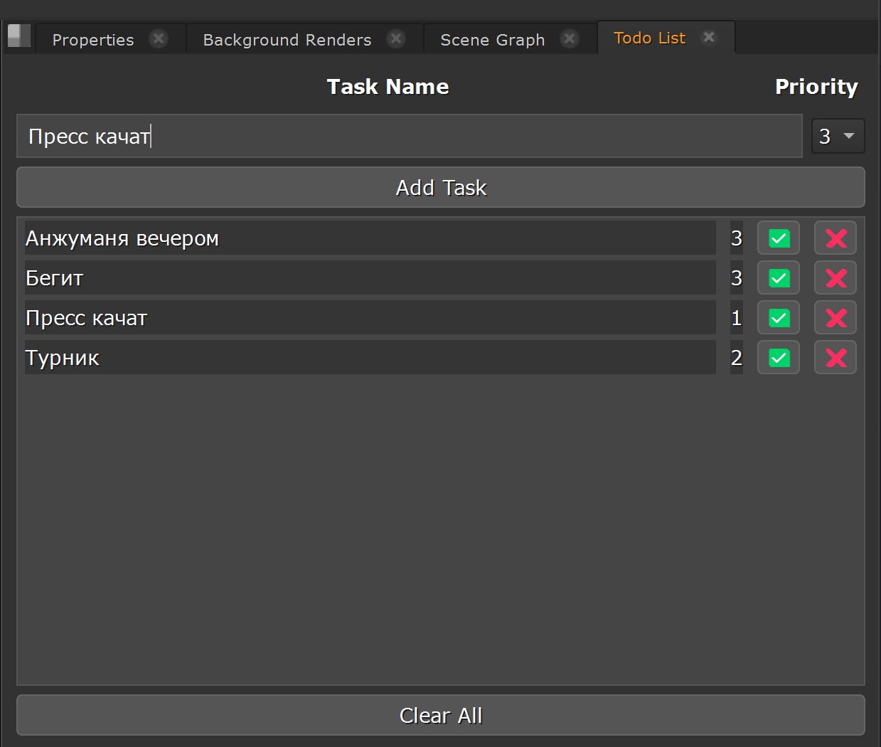 3. **Dynamic Task Items**: Each task is represented by a widget (`TaskItem`) displaying the task name, priority (1–3), and buttons to mark complete (✅) or delete (❌).