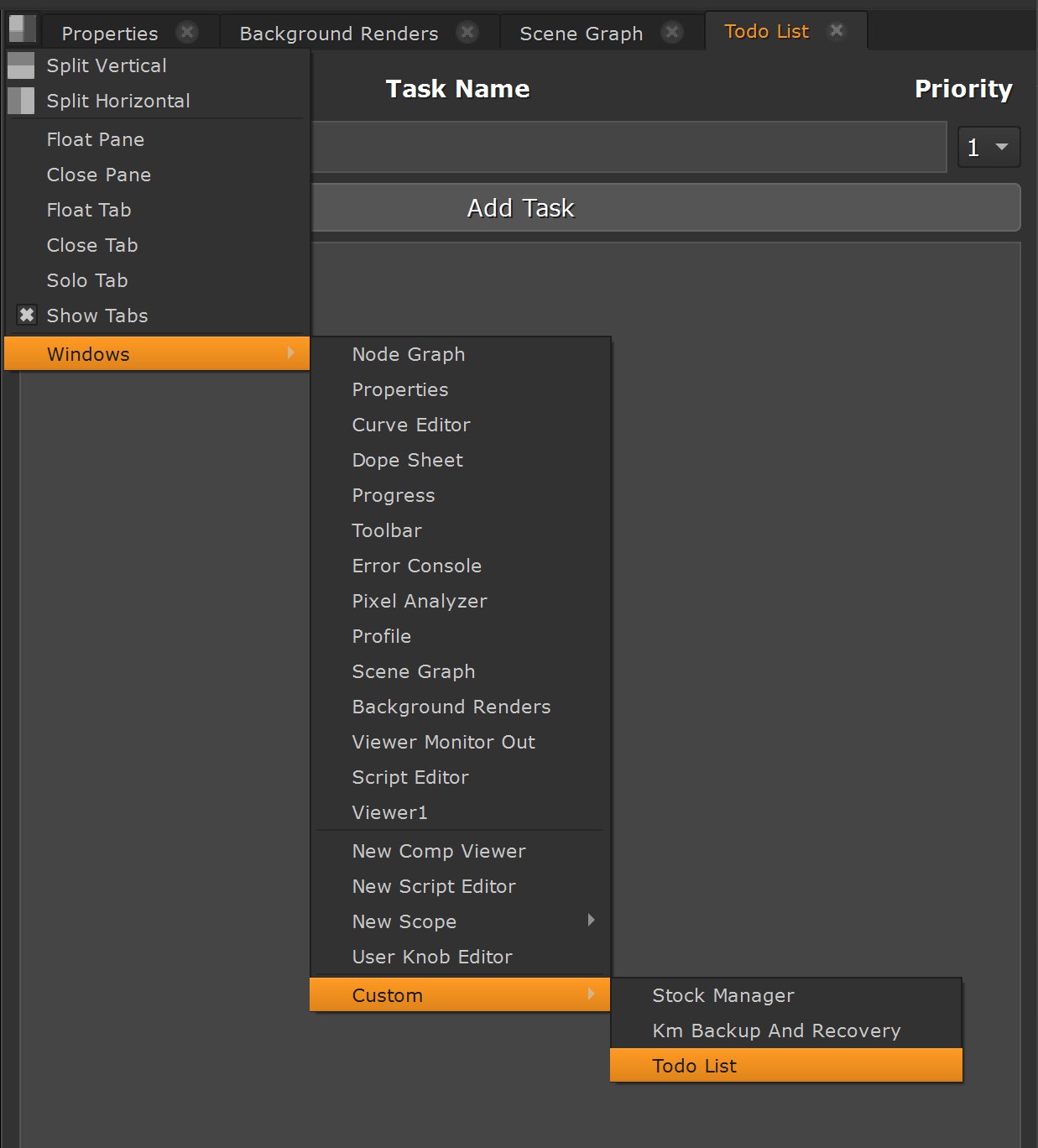 - Open the panel via **Pane → Windows → Custom → Todo List** in the Nuke menu.