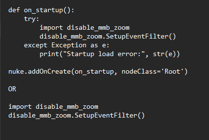 It preserves all normal mouse behavior (including MMB drag pan) and only blocks the MMB click zoom/zoom-to-fit in the Node Graph. It retries installation until Nuke’s Qt UI is ready, then distinguishes click vs drag using a small cursor-movement threshold.