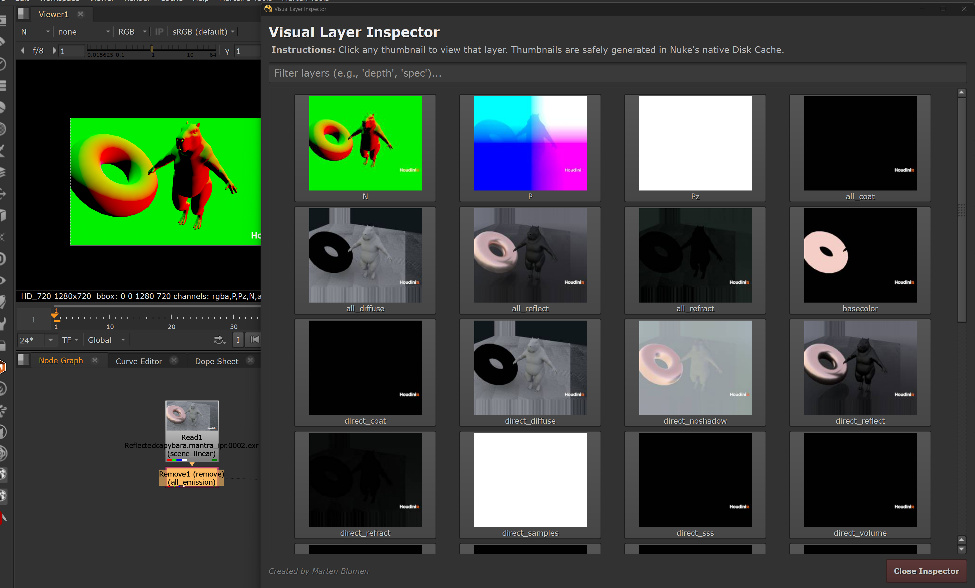 The Visual Layer Inspector is a powerful Python-based utility for Nuke designed to streamline the process of multi-channel EXR management. Instead of cycling through a long list of layer names in the Viewer dropdown, this tool generates a grid of thumbnails that allows compositors to visually identify and select the desired layer.