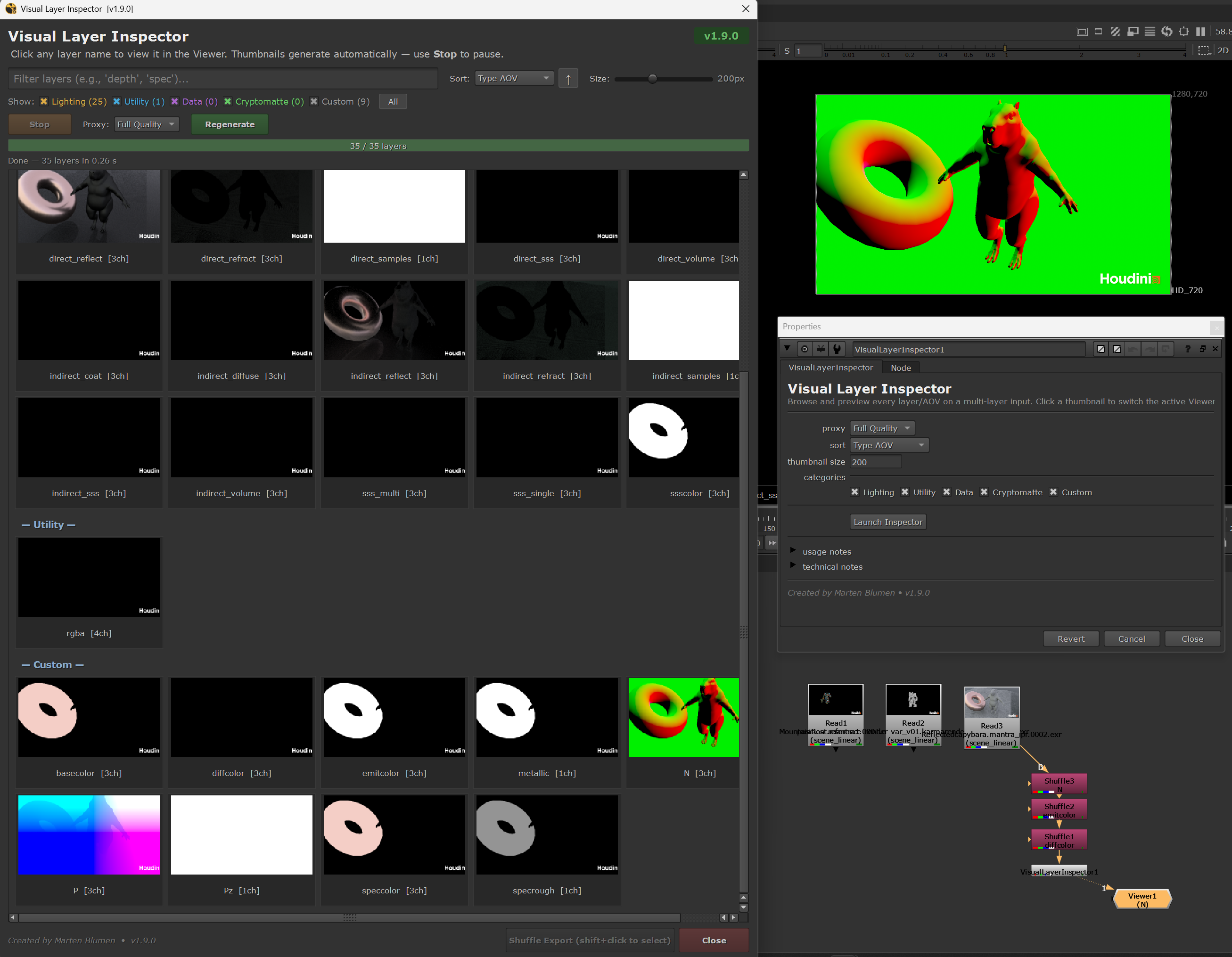 New features include Shuffle Export (shift+click to pin layers, then batch-create Shuffle2 nodes), auto-rescan when the input changes, viewer channel auto-restore on close, and progressive thumbnail rendering so you can start browsing before all layers have finished generating.